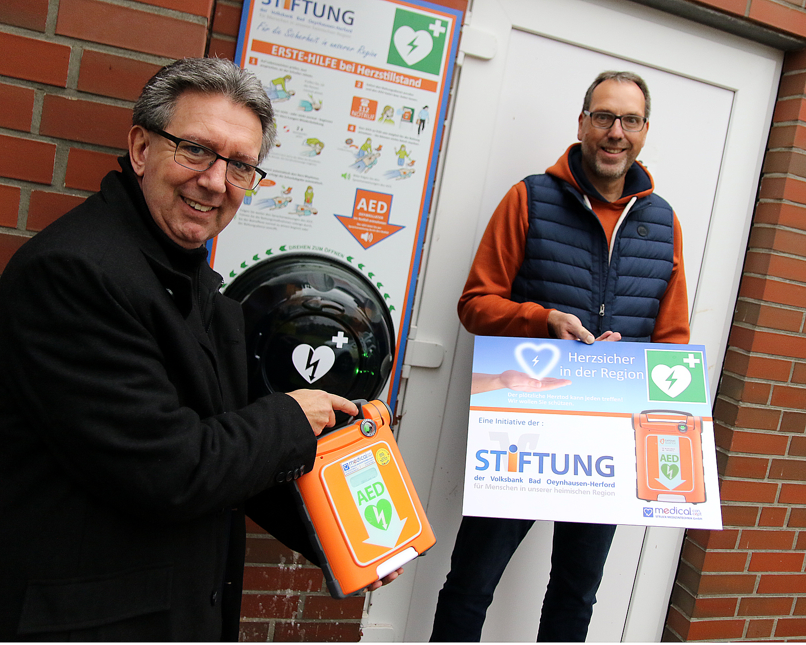 Überbringer dieses AED-Gerätes (Automatisierter externer Defibrillator) beim Sportverein war nun Andreas Kelch als Vertreter von der Stiftung der Volksbank Bad Oeynhausen-Herford. Diese Stiftung (siehe auch weiteren Text) hat seit 2011 schon viele Sportvereine und Institutionen im Kreis Herford und dem Stadtgebiet Bad Oeynhausen mit dem kleinen lebensrettenden Gerät ausgestattet, das von Struck Medizintechnik in Enger vertrieben wird. Zwei Drittel der Kosten übernimmt die Stiftung von der Volksbank Bad Oeynhausen-Herford und ein Drittel zahlt der jeweilige Empfänger, in diesem Fall der TuS Victoria Dehme. Das ist eine große finanzielle Hilfe.